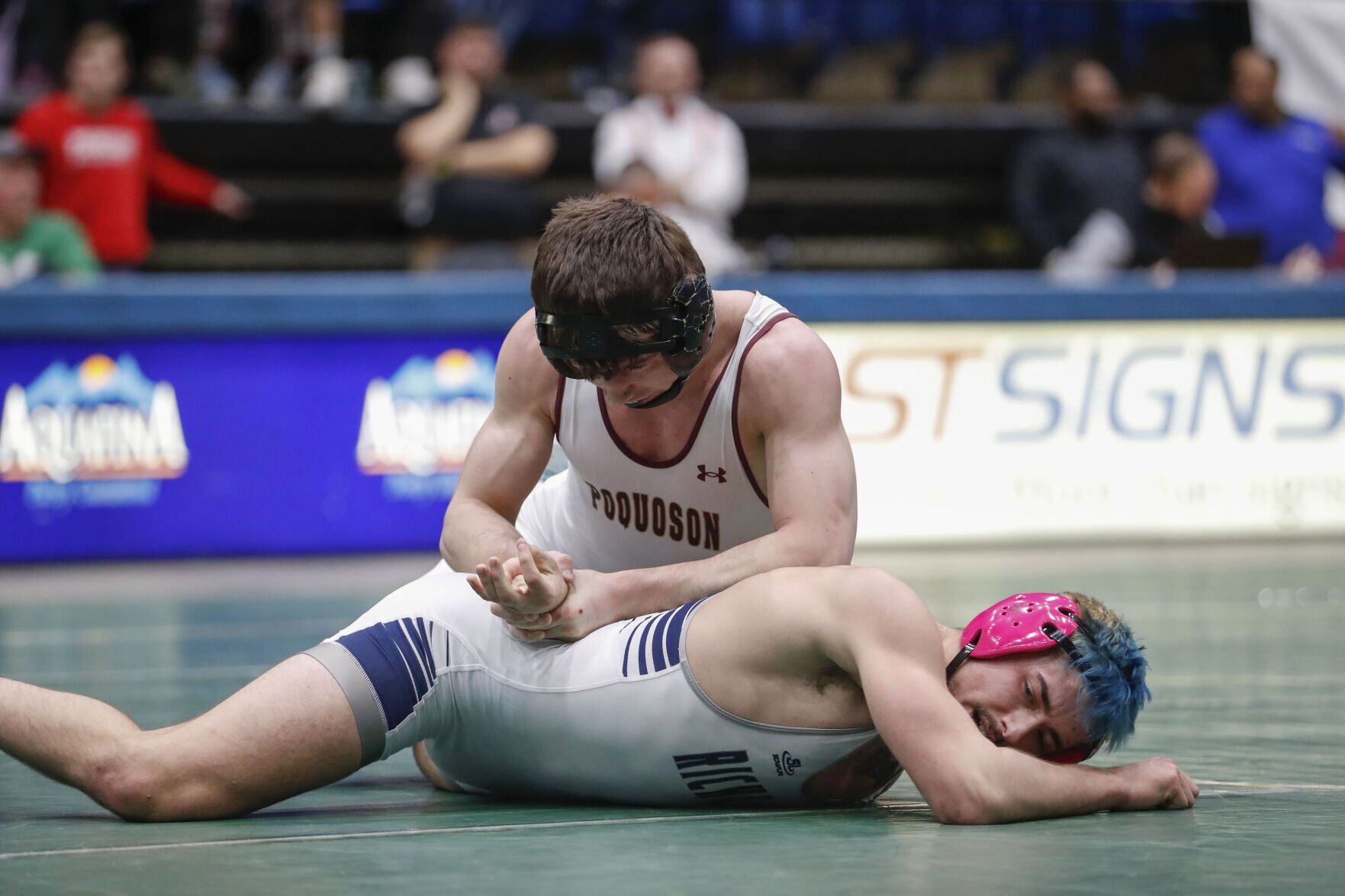 Poquoson's Reed Booth won over Richlands' Andrew Boyd Saturday night in the VHSL Class 2 157 State Wrestling finals.