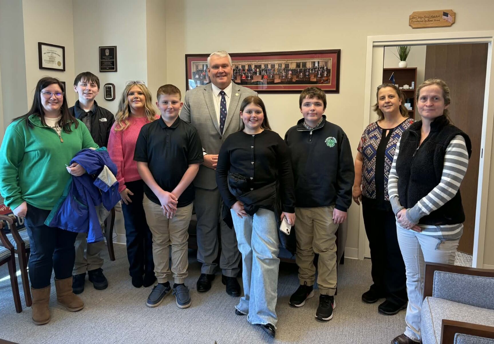 Laura Patterson- 4-H Dog Club Leader, Brody Palmer, Bella Lucas, Jaxon Patterson, Senator Travis Hackworth, Kynlee Sheppard, Danny Sparks, Kathy Dalton- 4-H Program Assistant, Tammy Bishop- Sparks- 4-H Extension Agent (not pictured Sophia Robinson)