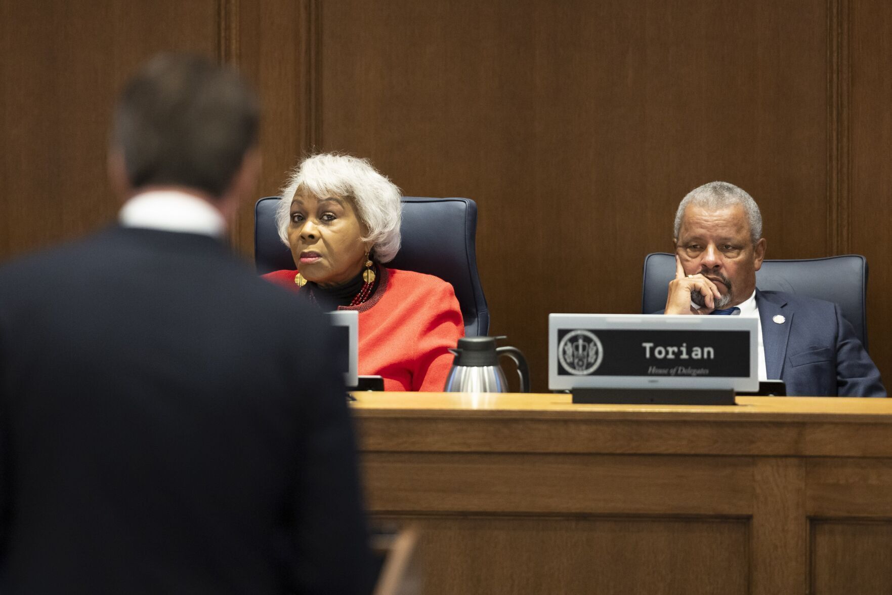 Senate Finance Committee chair Louise Lucas, D-Portsmouth, and Del. Luke Torian, D-Prince William, chair of the House Appropriations Committee, listen as Gov. Glenn Youngkin outlines his budget proposals at a joint meeting of the legislature’s money committees, Wednesday, Dec. 18, 2024.