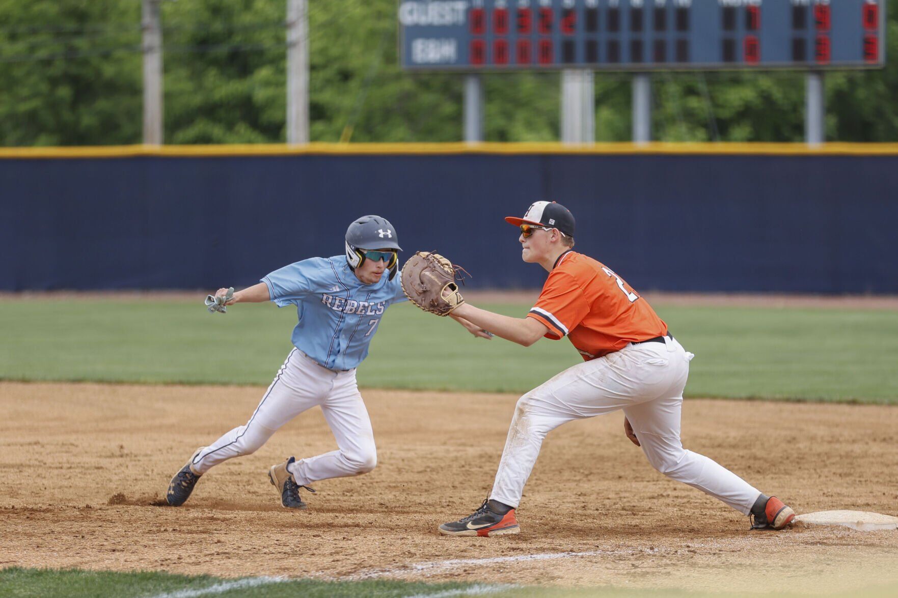 Honaker's Caden Altizer takes the throw at first base as Blake "J.J." Johnson dives back to the bag during the 2025 Hogoheegee District tournament.