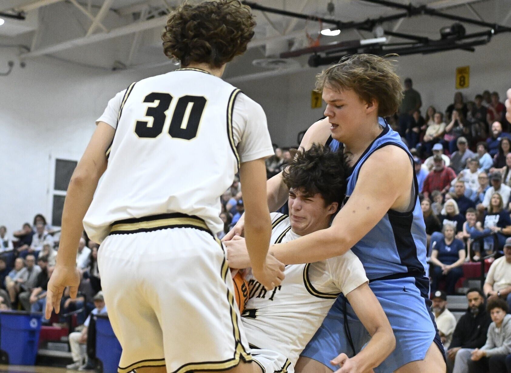 Fort Chiswell guard Owen Jackson (2) fights Patrick Henry forward Jay Barfield (41) for a rebound.